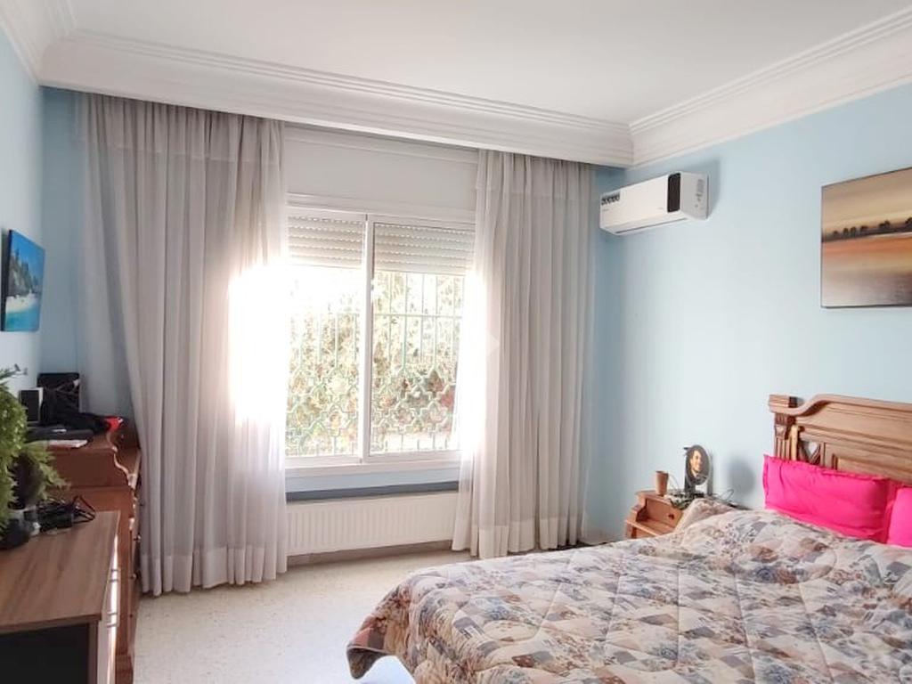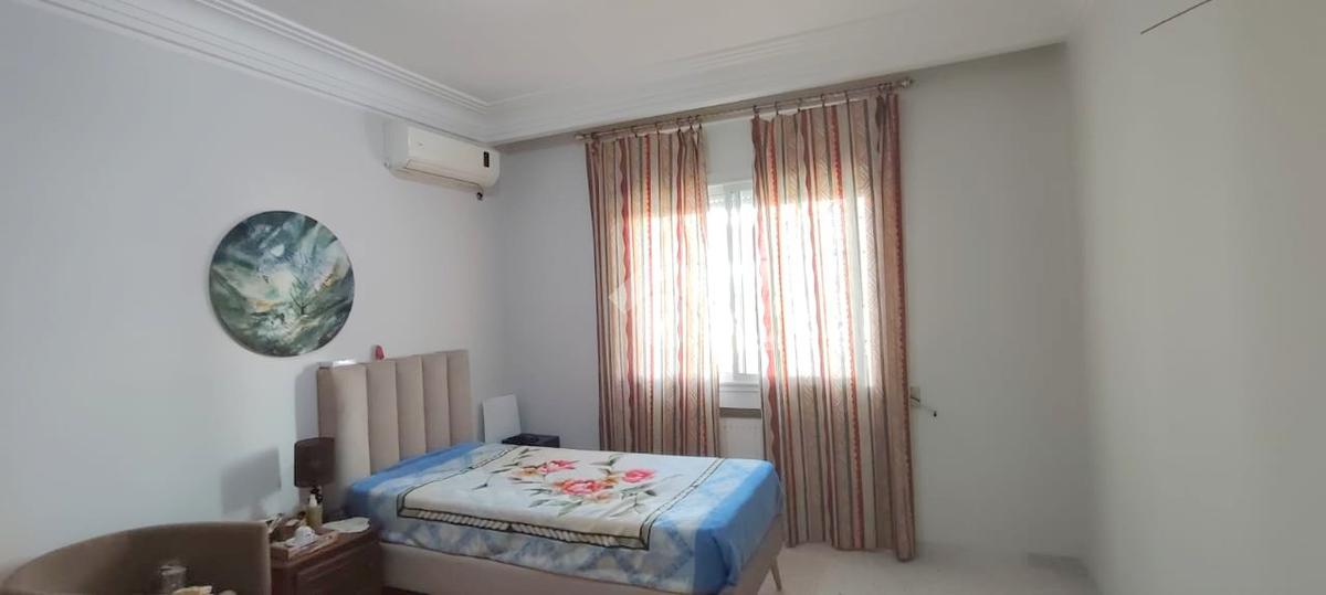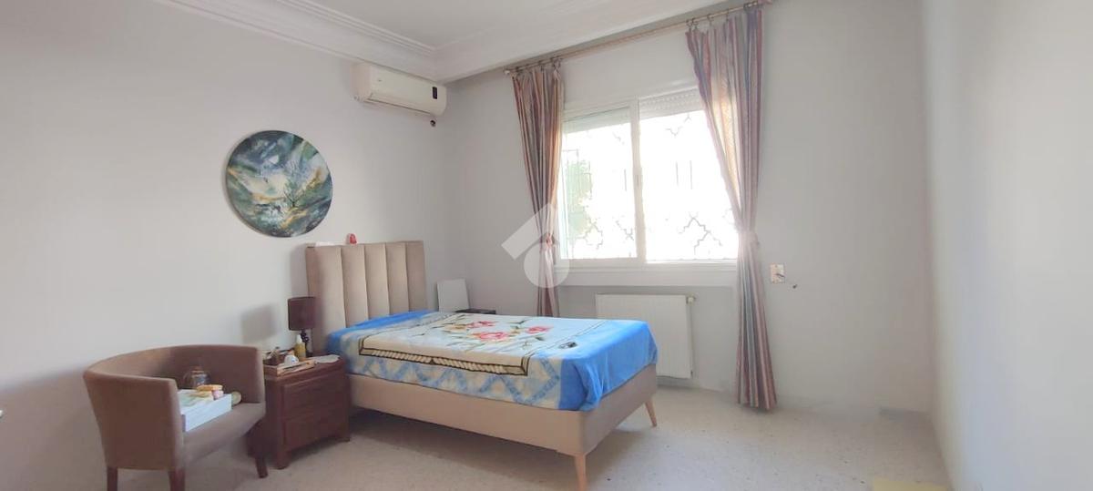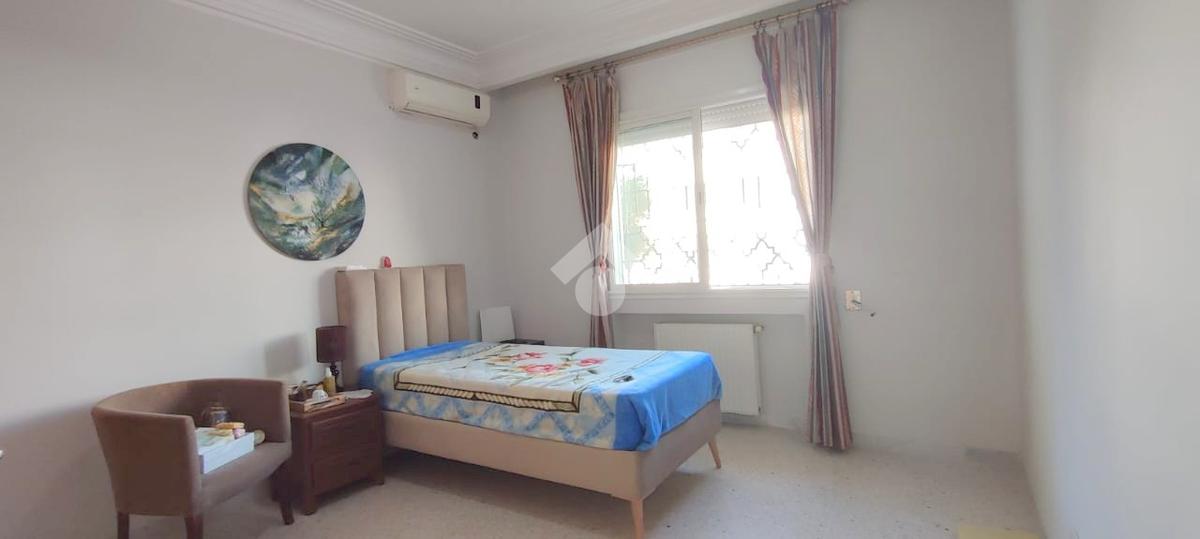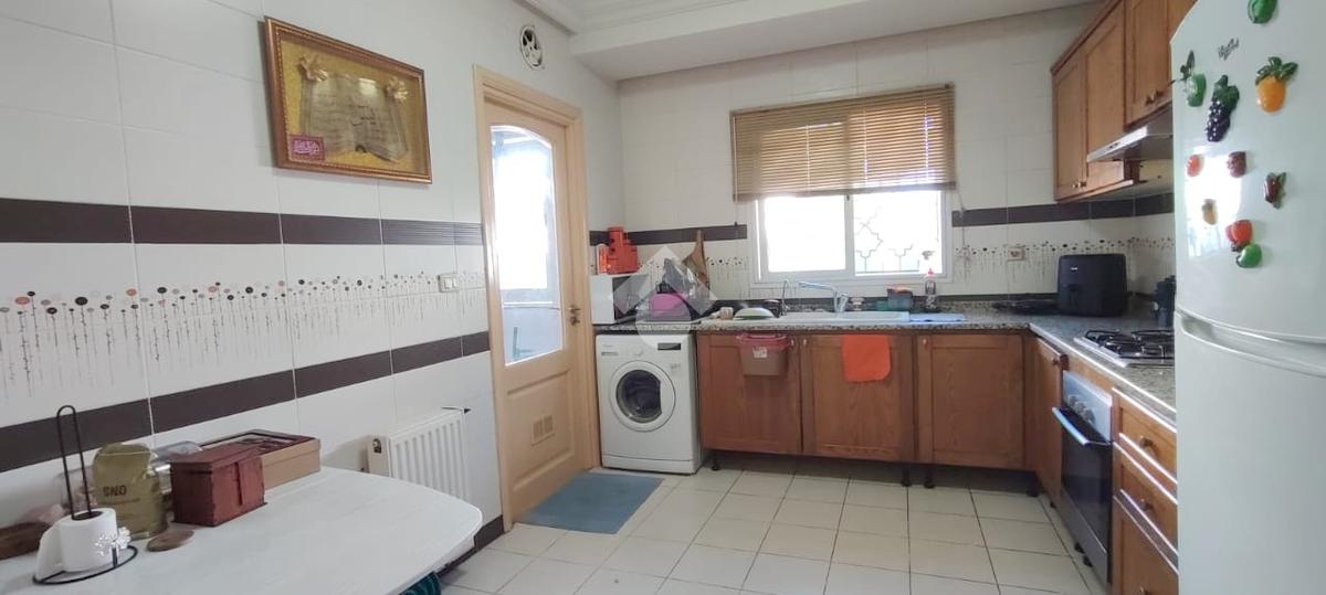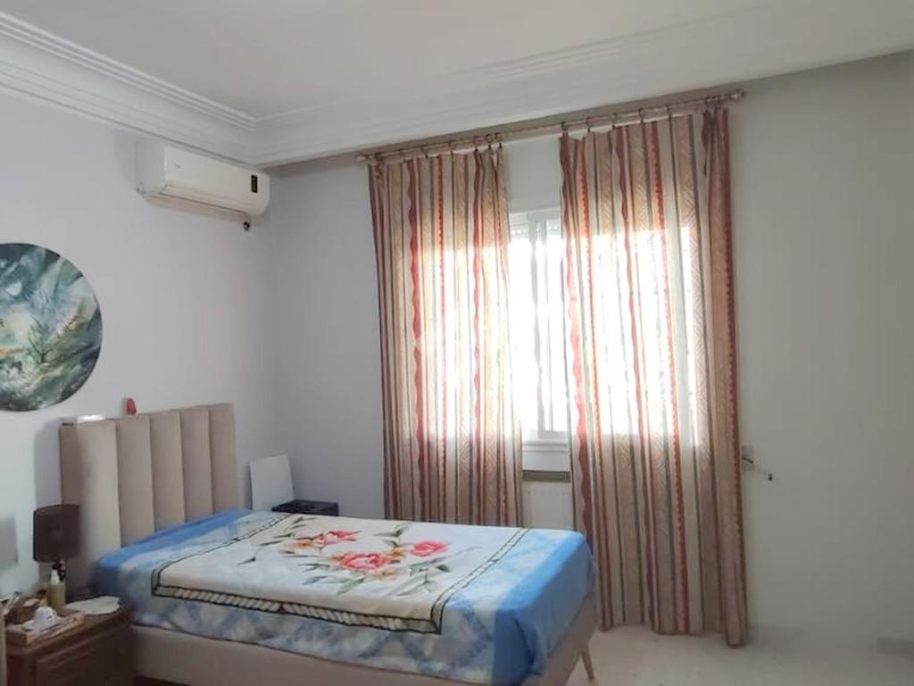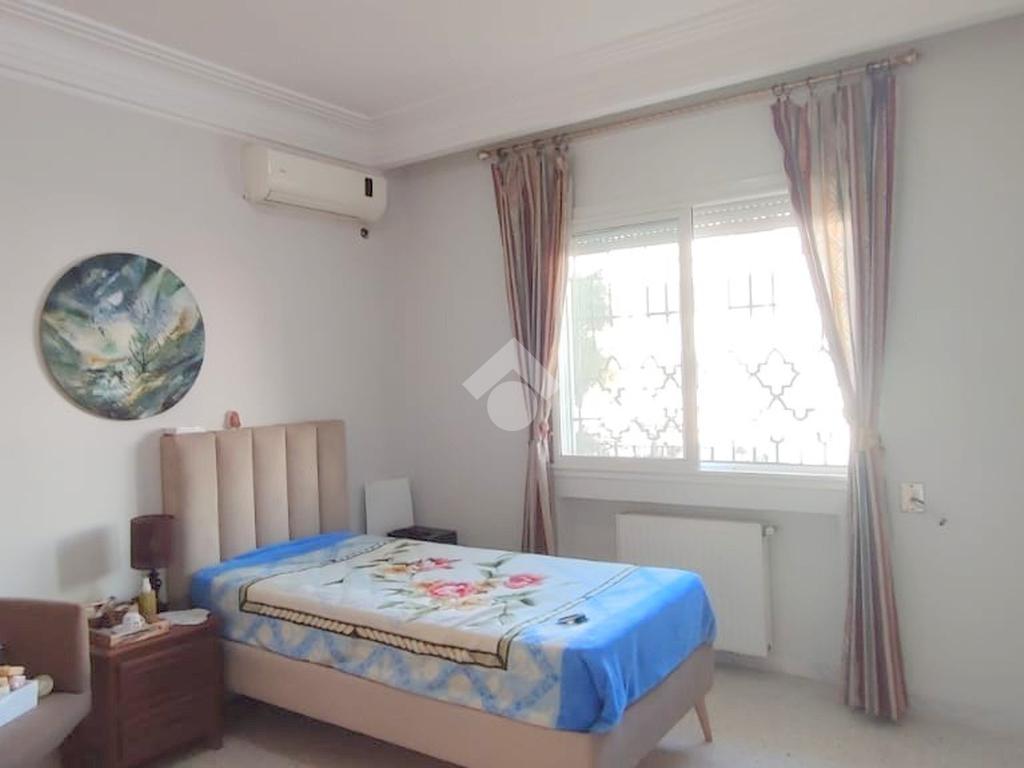 Cet appartement de type S+3 occupe le Rez de chaussée d’une résidence gardée en R+2.Il bénéficie d’une bonne orientation. La pièce de vie permet d'aménager un salon et une salle à manger. Elle offre également un accès à une terrasse. Une salle d'eau pour les invités est cuisine est équipée d'une plaque, d'une hotte aspirante et d'un four, et dispose d'un séchoir exploitable.La partie nuit loge trois chambres à coucher, elles se partagent une salle de bain commune. Elles sont équipées par dressing. L'appartement est équipé de chauffage central et de la climatisation en Split système.